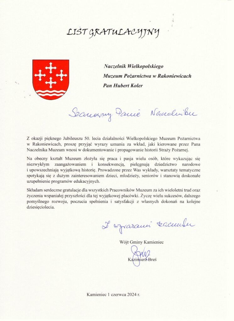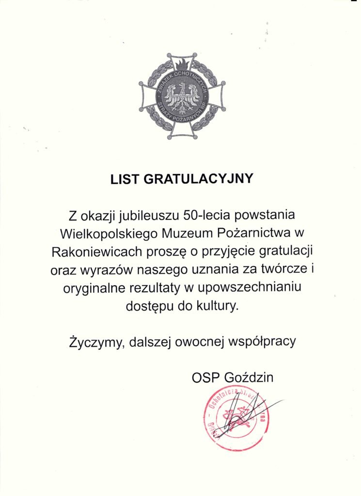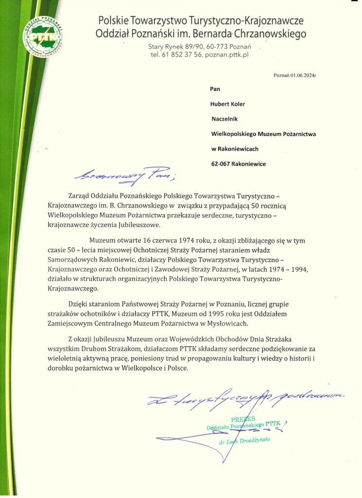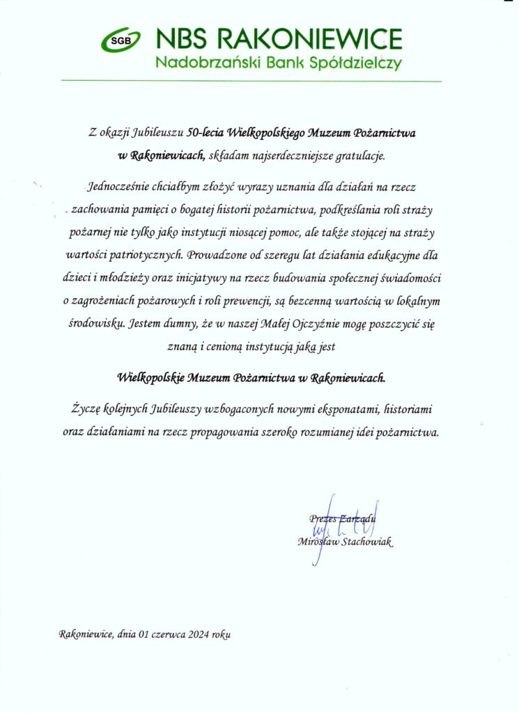 1 czerwca 2024 roku na rynku w Rakoniewicach odbyły się uroczystości z okazji Wielkopolskich Wojewódzkich Obchodów Dnia Strażaka połączonych z Jubileuszem 50-lecia Wielkopolskiego Muzeum Pożarnictwa w Rakoniewicach.